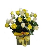 5朵白百合,35朵鮮花(太陽花,白玫瑰,康乃馨),散尾葵豐滿搭配。